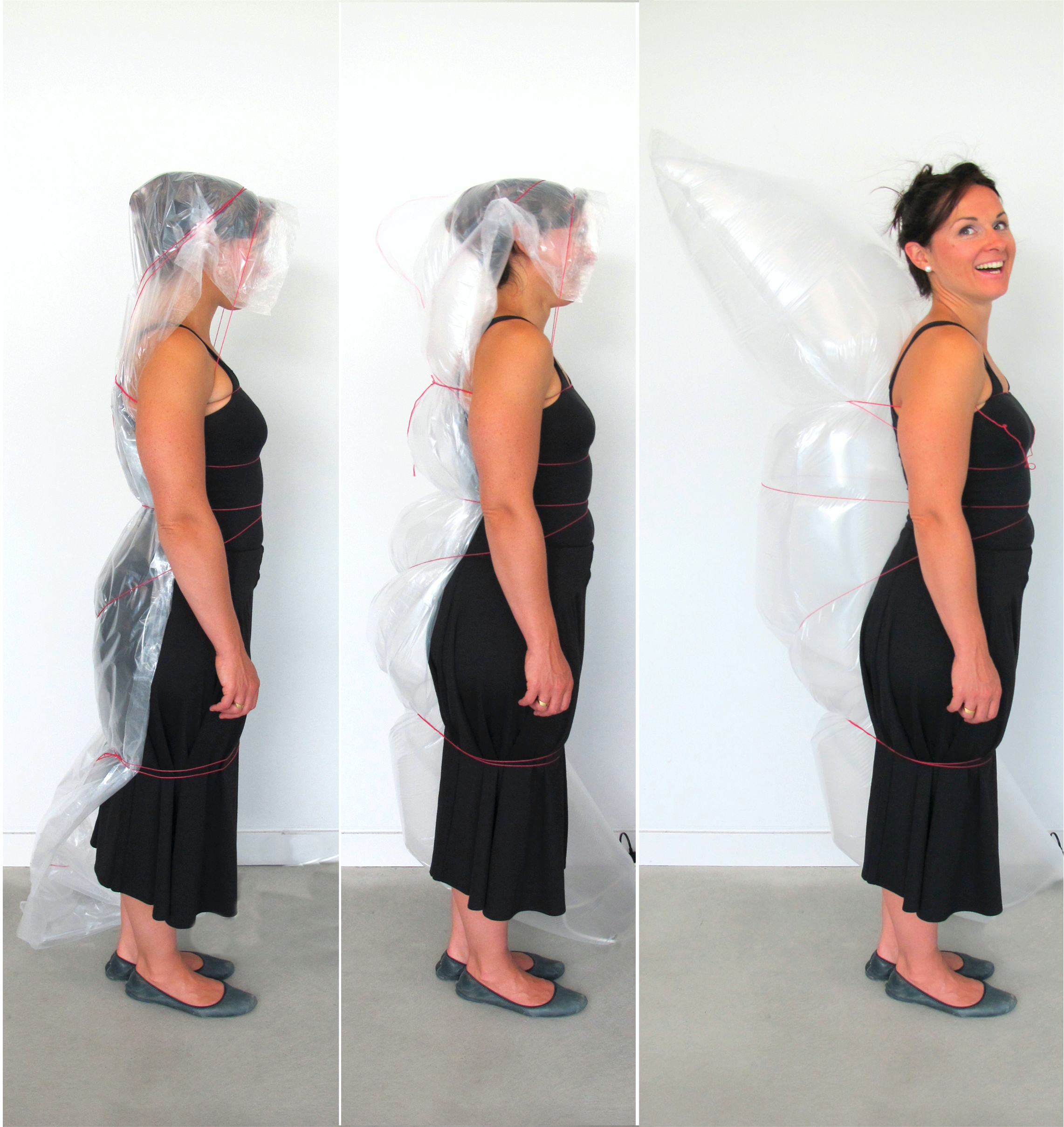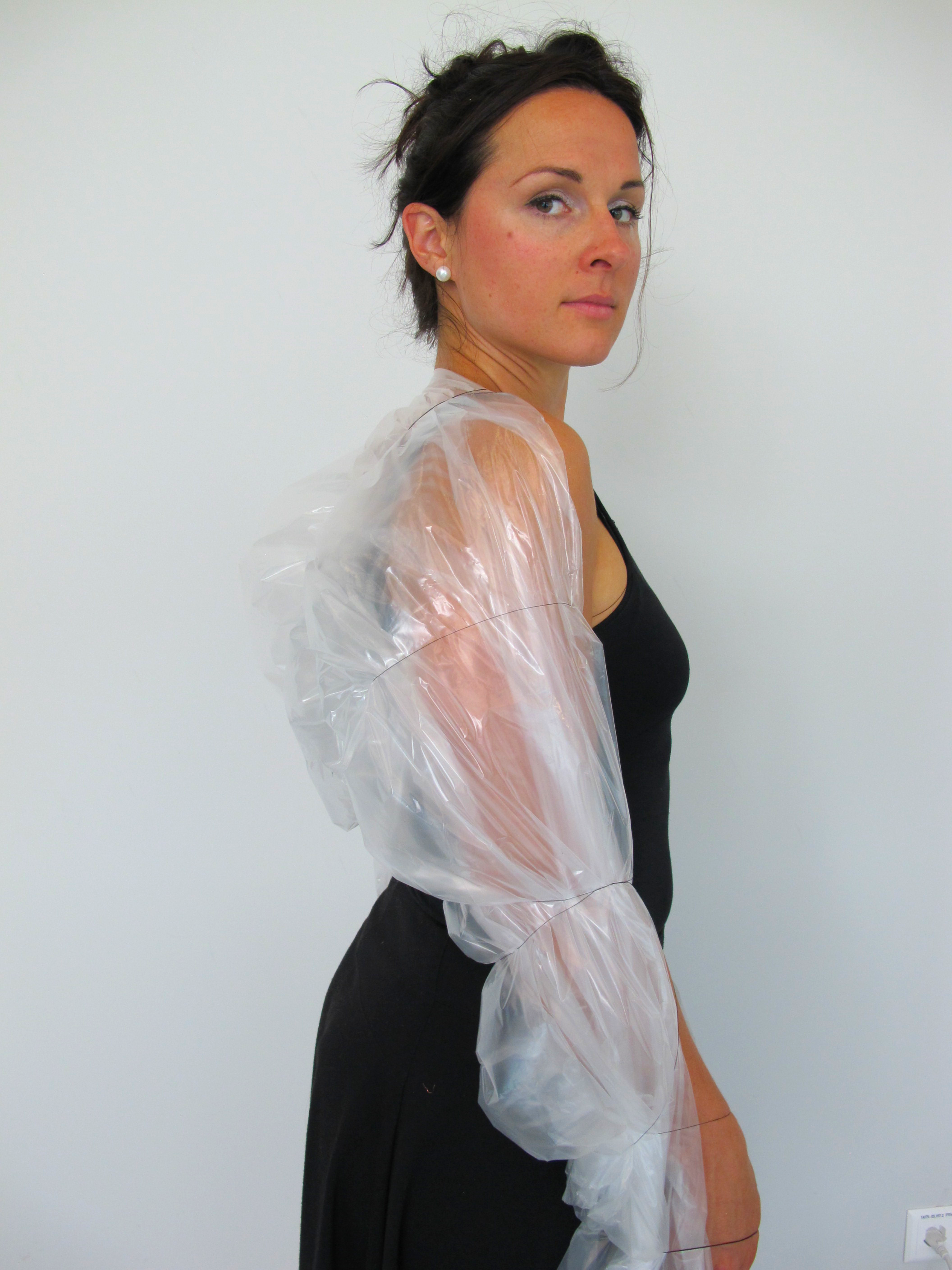 Silicone sheets applied to the body, inflating skin like air muscles tailored out of thread.